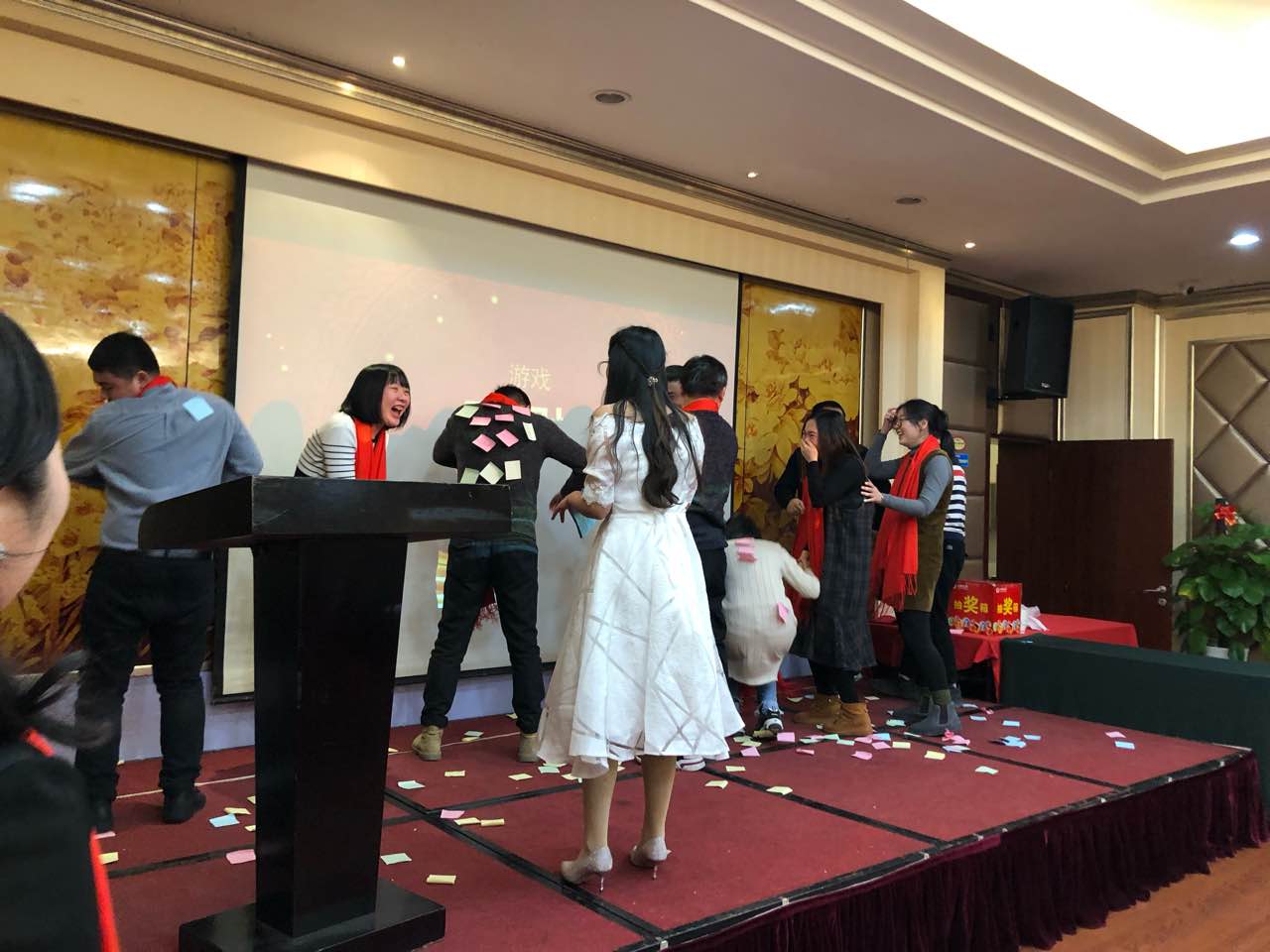 联欢会丰富多彩的文娱节目,同时还穿插互动游戏、抽奖等环节,一阵阵掌声,欢笑声此起彼此……