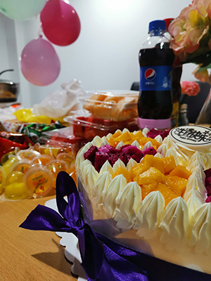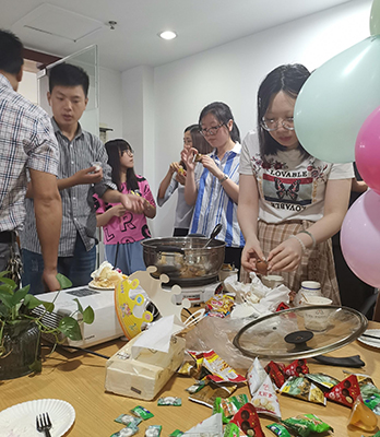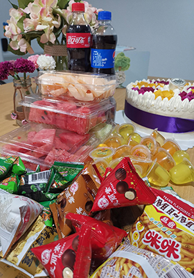 蛋糕、零食、水果、还有特殊的喜蛋哦,大家边吃边聊,其乐融融,幸福萦绕其中……