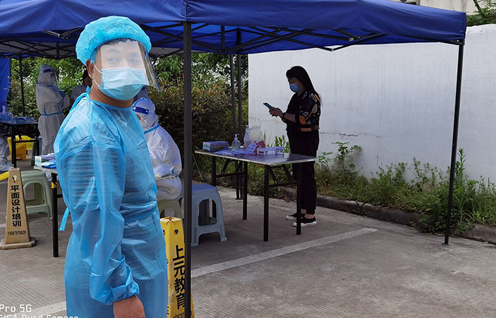 面对疫情防控,蓝狮在线党支部志愿者以积极负责的态度,和其他抗疫志愿者通力合作,正确快速的引导和身份核验,协助核酸检测医护人员,保障核酸检测采样工作高效、有序进行。