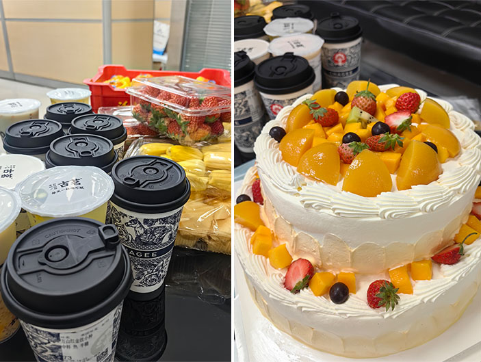 公司为大家送上精致的蛋糕、水果、奶茶、咖啡。