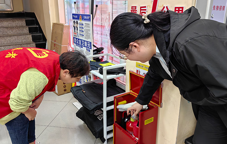 在反诈宣传过程中,志愿者们同时协助社区工作人员,进行了商户的消防设施检查,查看灭火器是否在有效期内,灭火器压力表指针是否在绿色区域,查看灭火器是否有定期维护和检查记录,有效消除商户消防安全隐患。